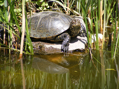 A blog elkészülte előtt három éve,2010 nyarán az udvarunkban lévő kis halastóban amiben aranyhalak vannak egy napon a feleségemmel egy teknősbékát fedeztünk fel.Kiderült ez a kedves kis állat egy mocsári teknős,aki bevette magát az aranyhalaink közé és azóta is jól érzi magát nálunk...