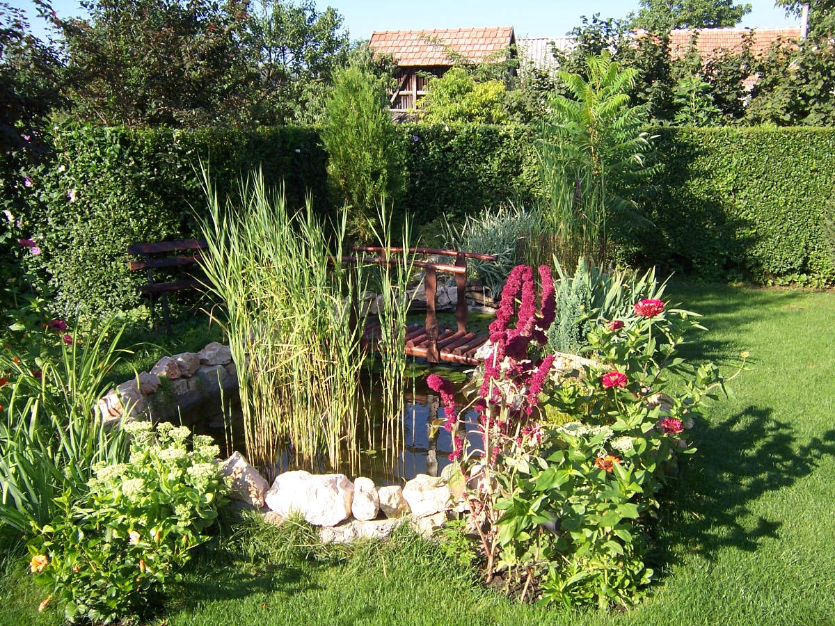 Itt él már három éve.Ennek a kis tónak minden évben más és más a környezete a növények virágok miatt.
