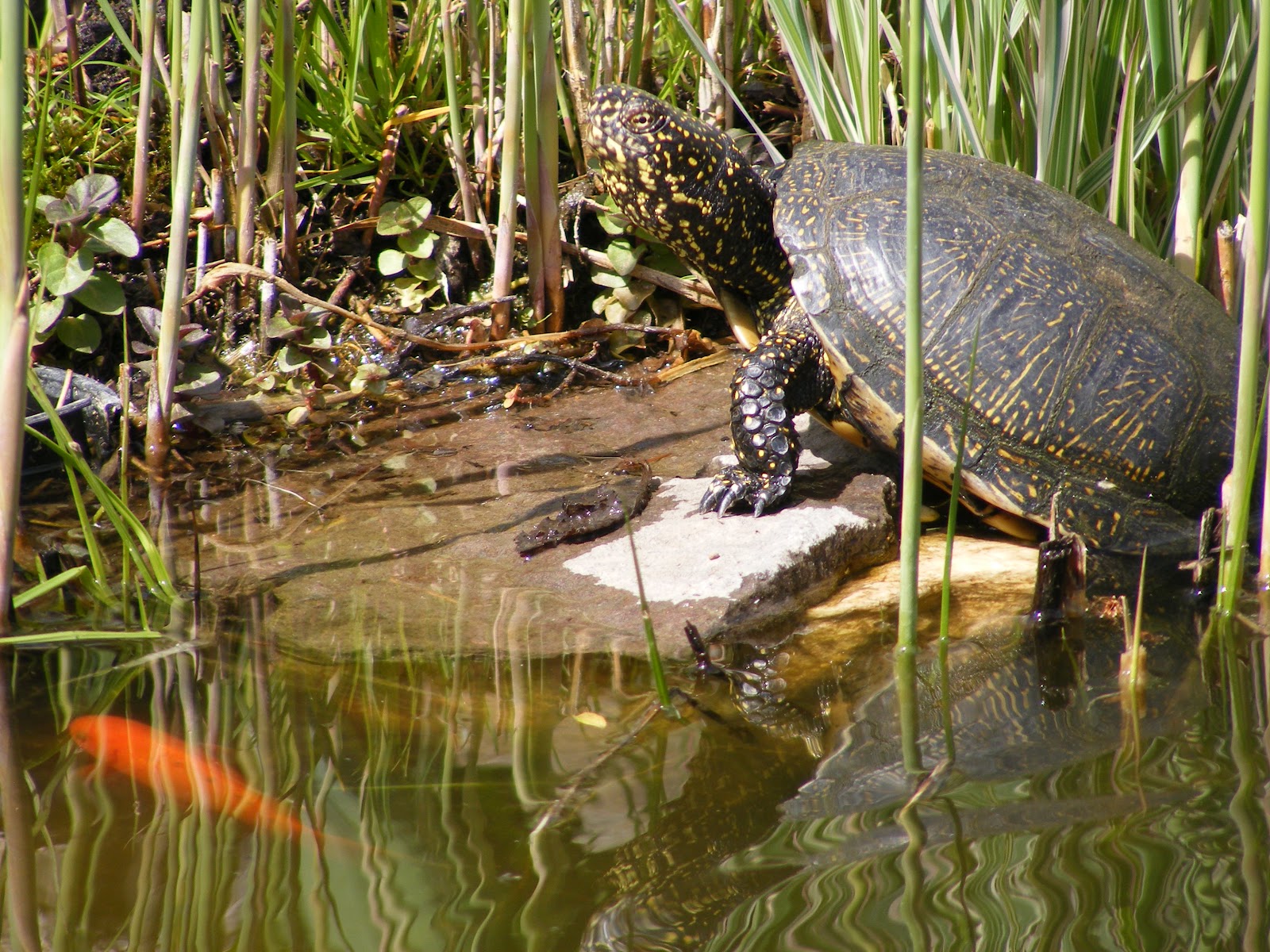 A blog elkészülte előtt három éve,2010 nyarán az udvarunkban lévő kis halastóban amiben aranyhalak vannak egy napon a feleségemmel egy teknősbékát fedeztünk fel.Kiderült ez a kedves kis állat egy mocsári teknős,aki bevette magát az aranyhalaink közé és azóta is jól érzi magát nálunk...